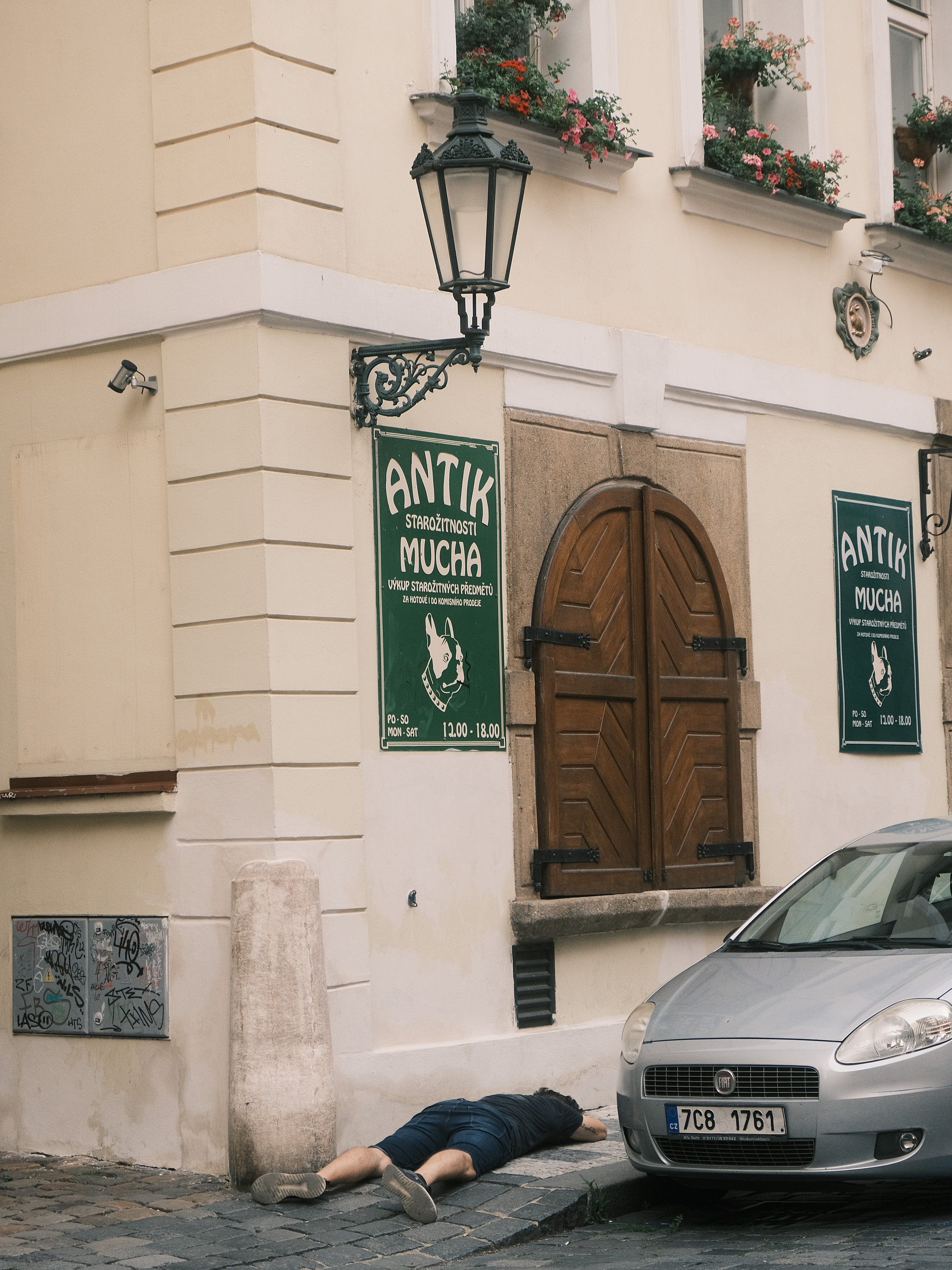 A woman standing outside a flower shop on a city sidewalk, surrounded by various potted plants and bouquets, with a mural painted on the wall behind her.